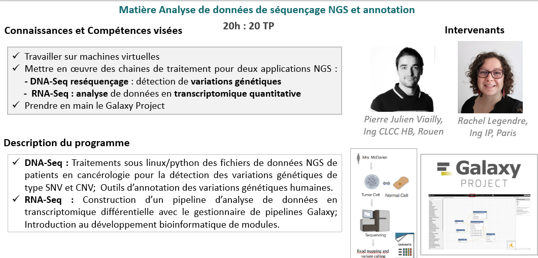 - Analyse de donnés NGS 20h TP- elle s'appuie sur la partie théorique de l'UE Génomique Transcriptomique et les apprentissages de l'UE Programmation Python.