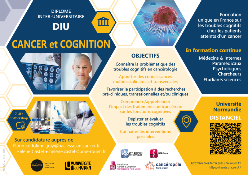 Le DIU “Cancer et Cognition” est proposée par l’Université de Rouen Normandie pour la rentrée 2025. Suite au succès de nos premières éditions, le programme a été retravaillé pour offrir une expérience d’apprentissage encore plus enrichissante et innovante.